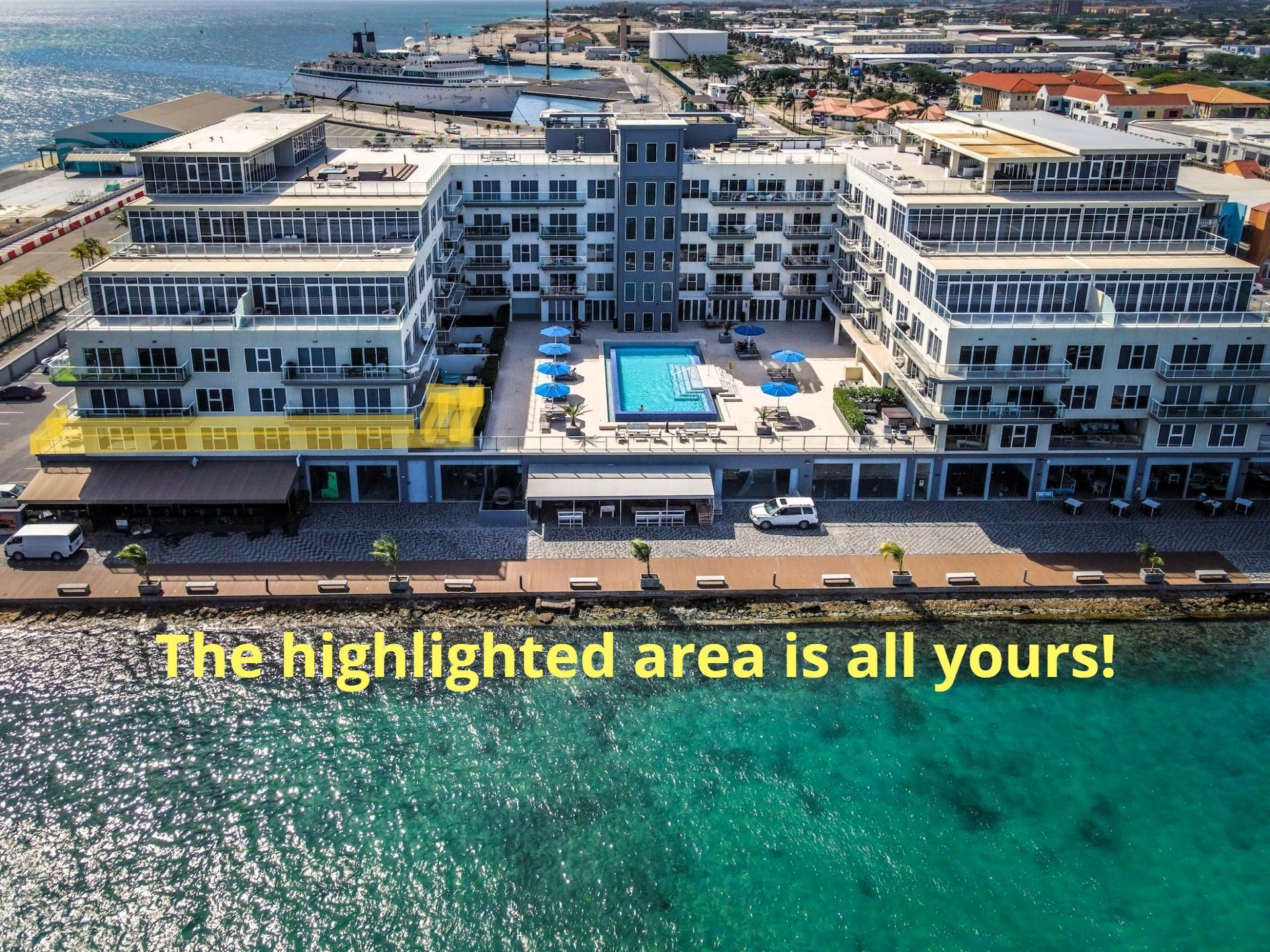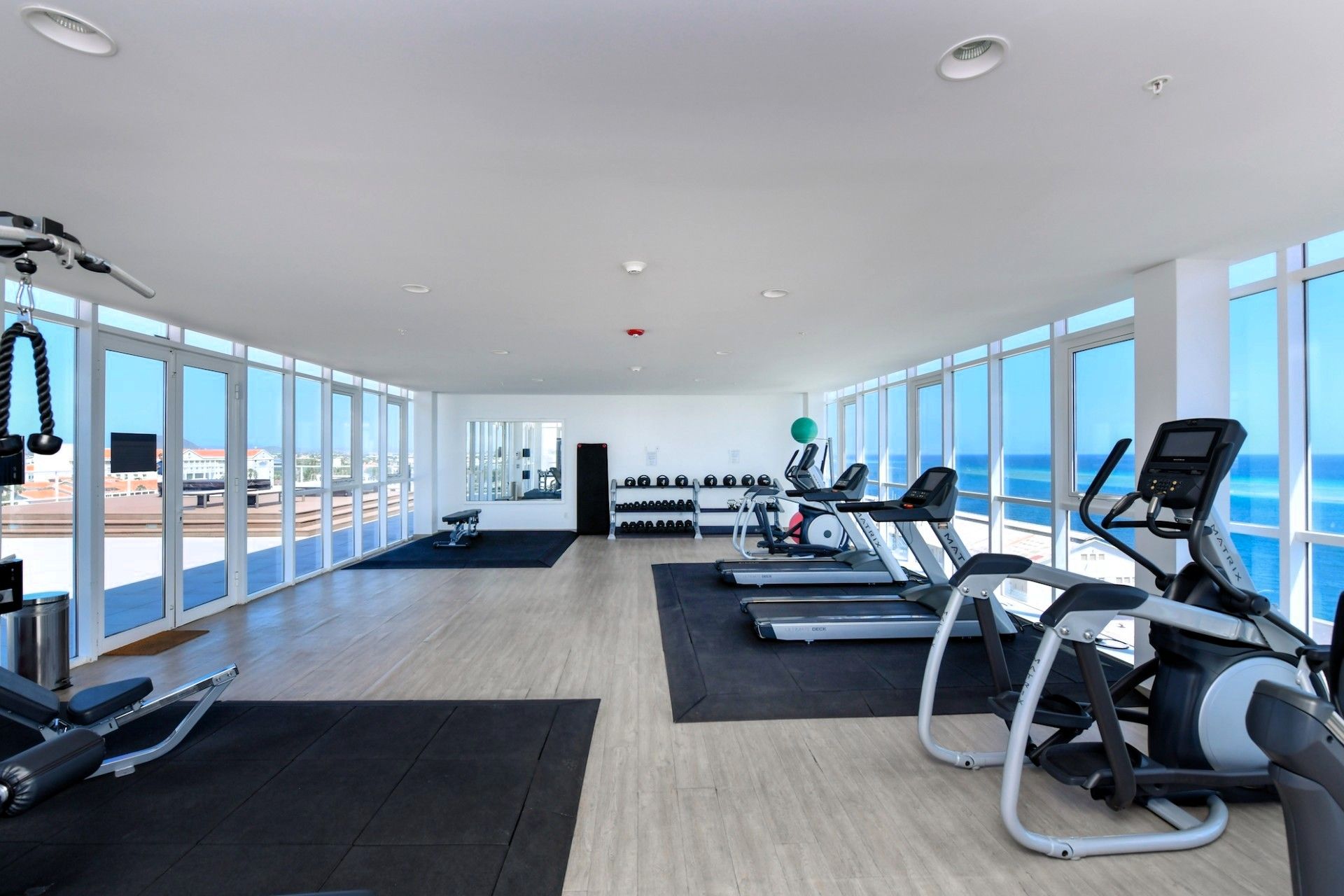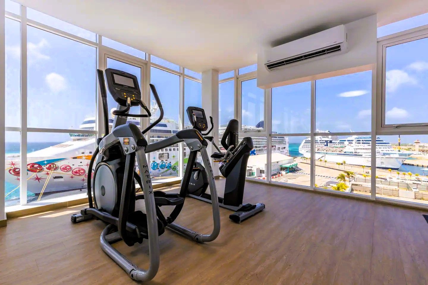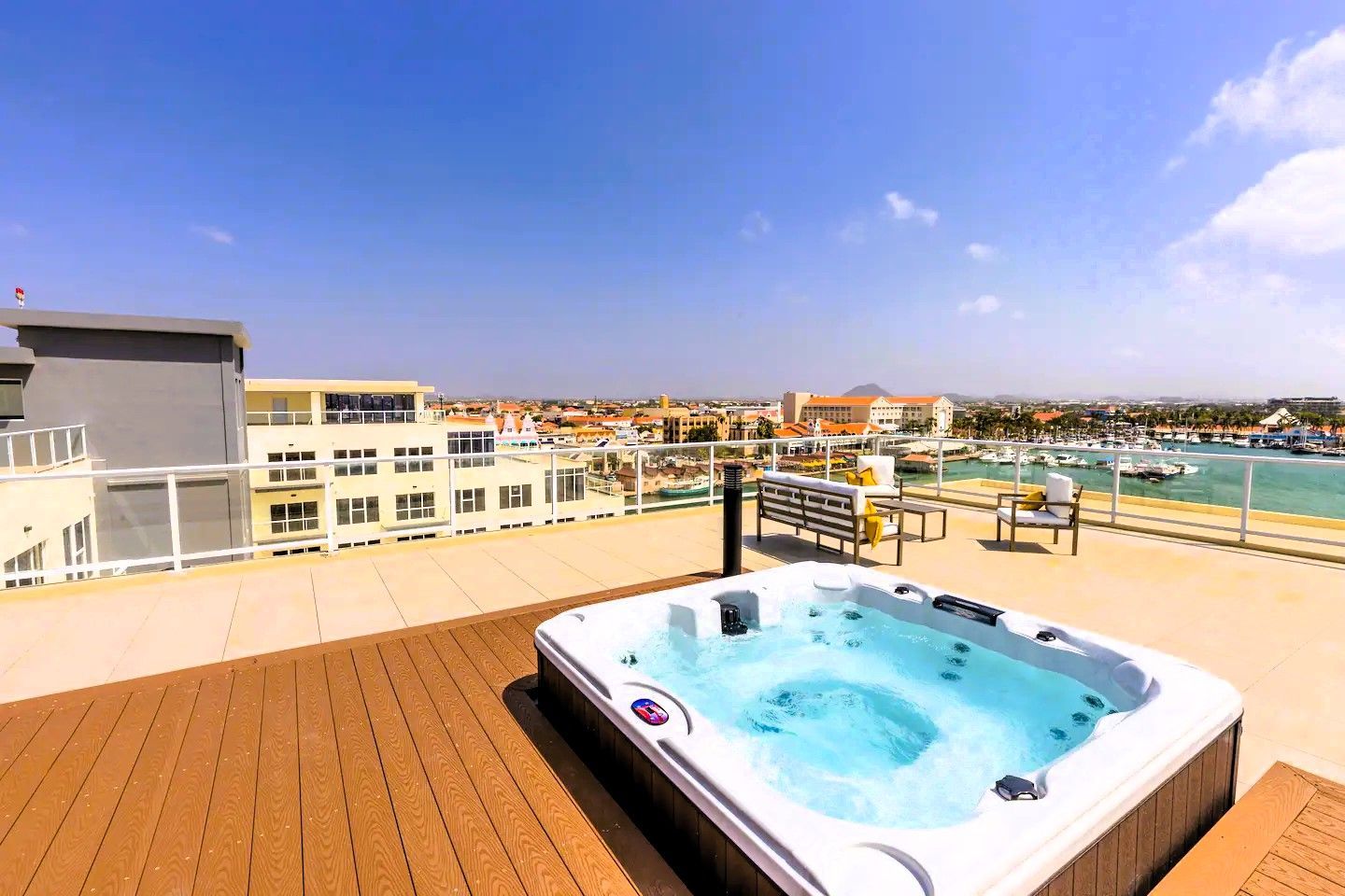 Four Winds guests enjoy a stunning infinity pool overlooking the Oranjestad Marina, a fully equipped fitness center on the top floor with a hot tub and sun deck, 360-degree views of the oceanfront surroundings, ground-floor restaurants, and five-star service all around.