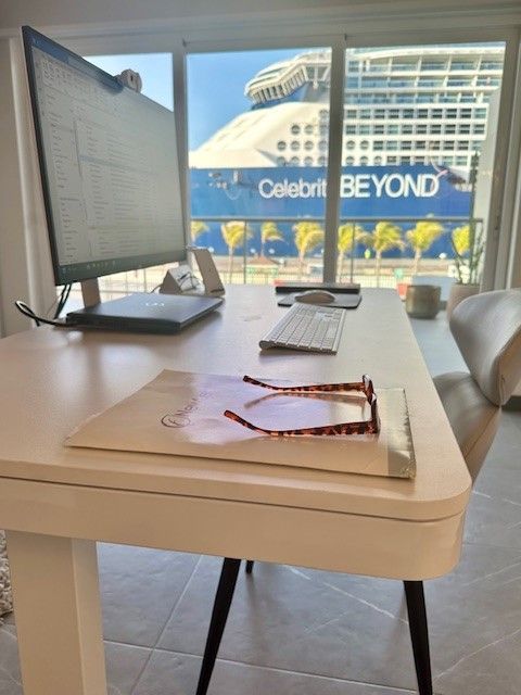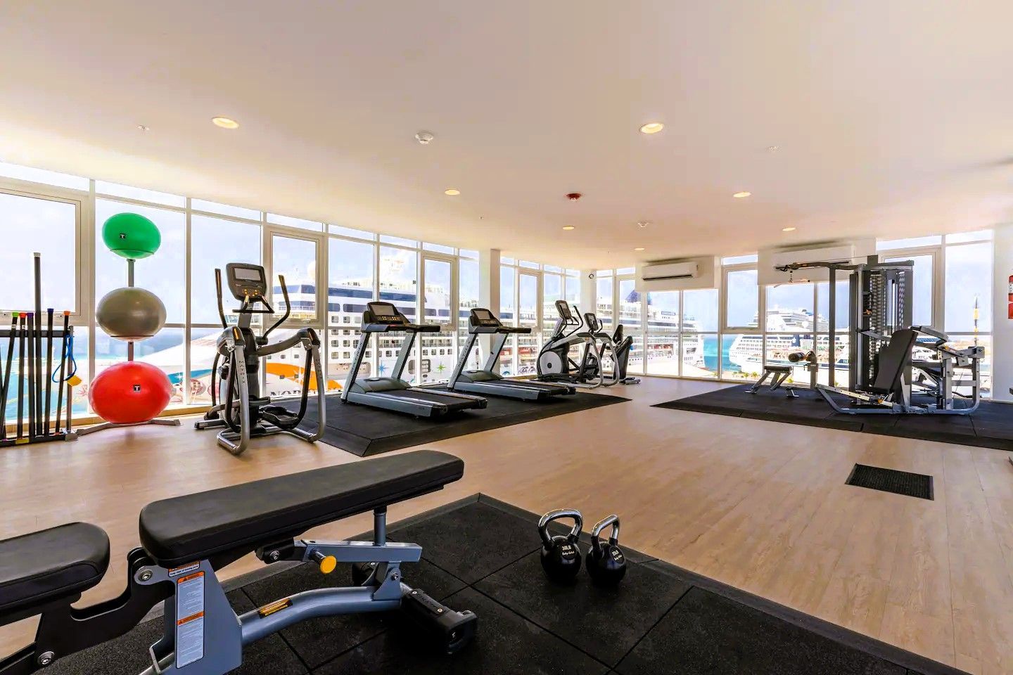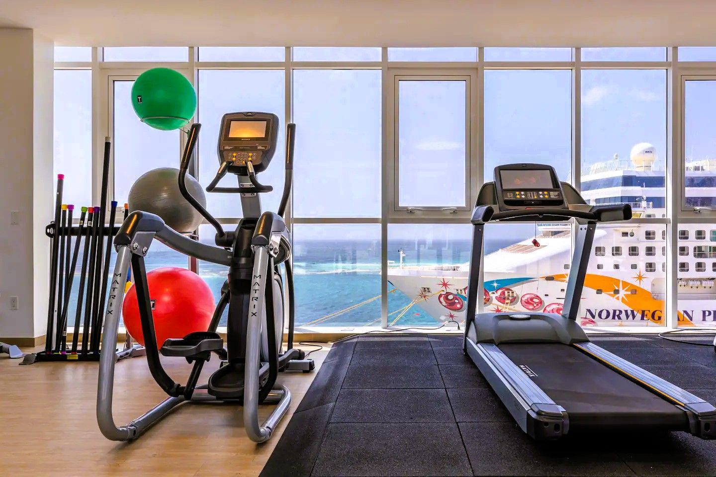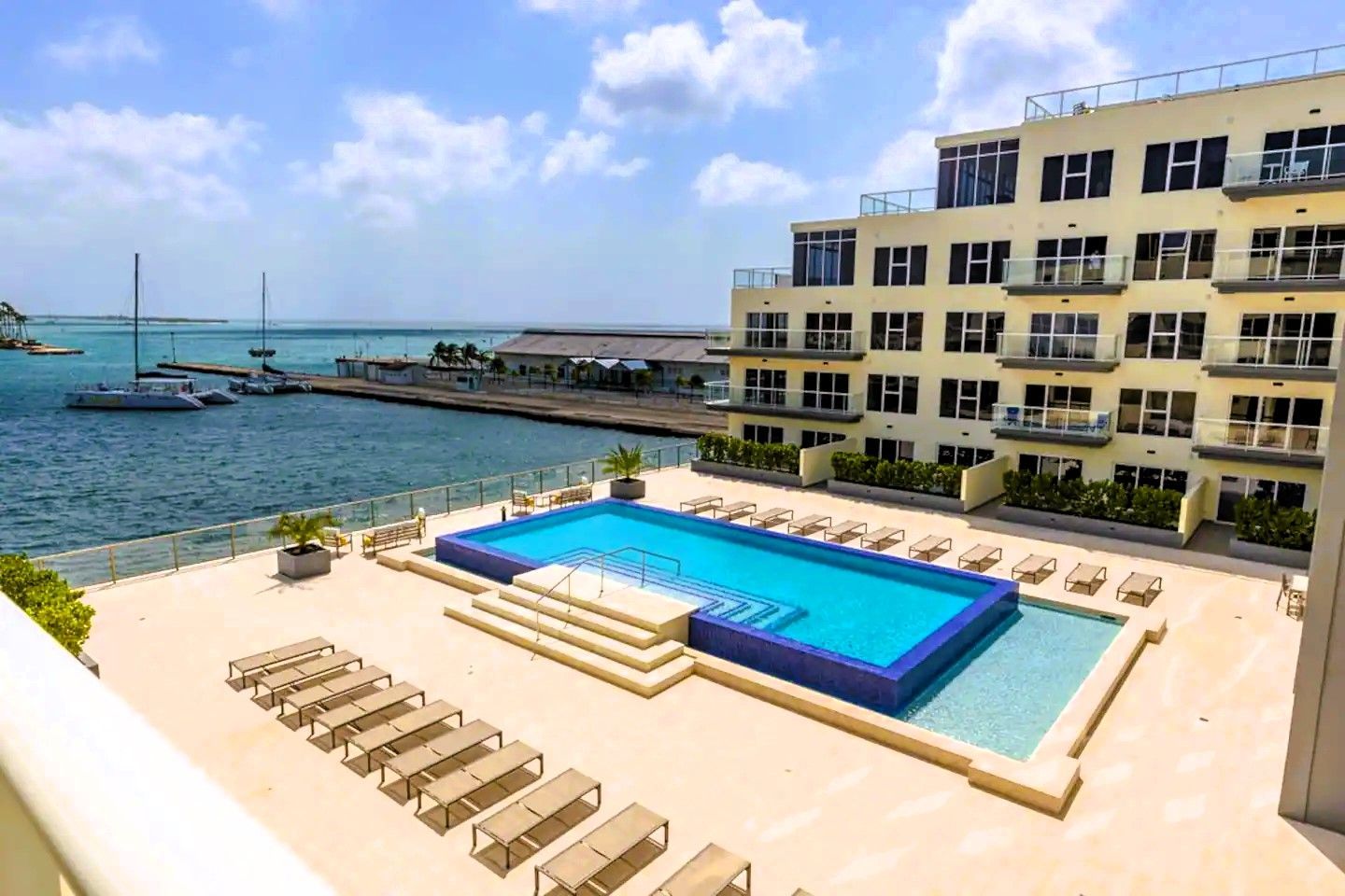 Four Winds guests enjoy a stunning infinity pool overlooking the Oranjestad Marina, a fully equipped fitness center on the top floor with a hot tub and sun deck, 360-degree views of the oceanfront surroundings, ground-floor restaurants, and five-star service all around.